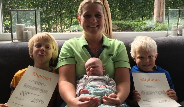 Ook een belangrijke dag voor Thijmen en Merijn, want ze behaalden hun echte mini-kraamzorg Diploma! Dik verdiend, omdat ze Wilma zo goed geholpen hadden. Bijvoorbeeld met het luier verschonen, de baby vasthouden en hem in bad doen. Leuk he!!
